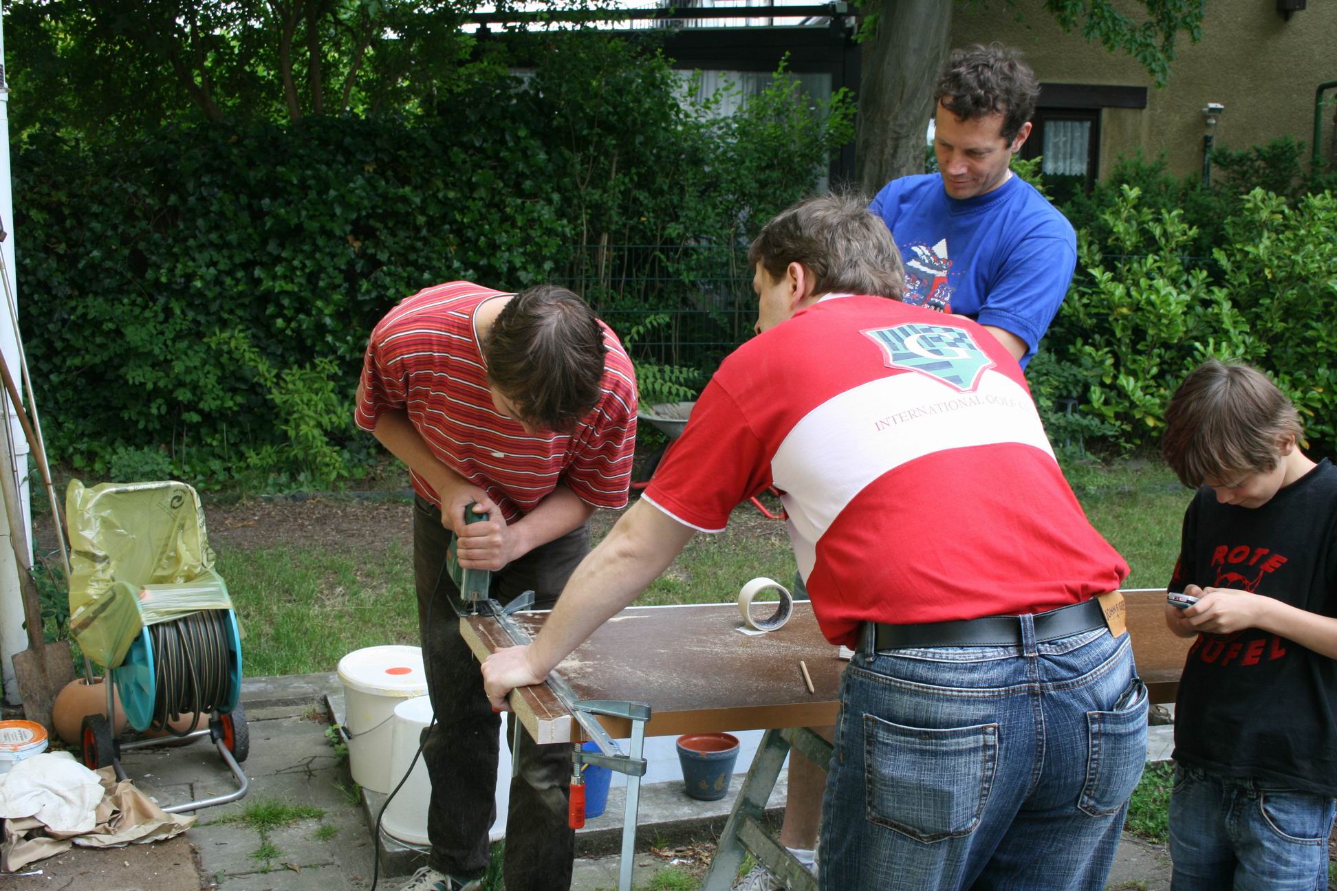 Alle drei, beim Zurechtsägen der Arbeitsplatte. - 2. Juni 2007
